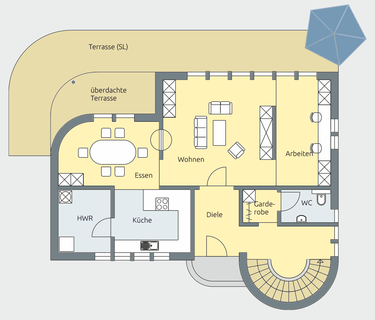 Artdeco 20 interpretiert den Bauhaus-Stil auf eigenständige Weise und verbindet sachliche Architektur mit weichen, fließenden Formen. Das runde Treppenhaus setzt bereits im Eingangsbereich ein starkes architektonisches Zeichen und verleiht dem Haus seine unverwechselbare Identität.