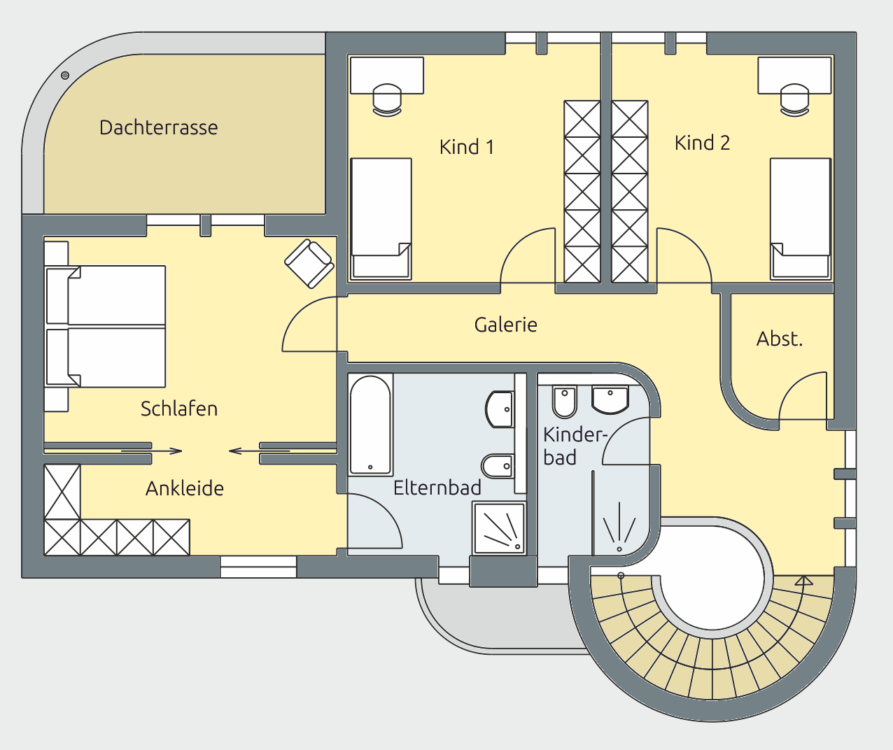 Im Obergeschoss setzt sich das architektonische Spiel fort. Eine offene Galerie verbindet die Räume und führt in den privaten Bereich. Zwei großzügige Kinderzimmer, ein eigenes Kinderbad sowie ein komfortables Elternbad bieten viel Platz für das Familienleben. Das Elternschlafzimmer mit Ankleide bildet eine ruhige Rückzugseinheit. Highlight ist die großzügige Dachterrasse – ein geschützter Ort für entspannte Stunden unter freiem Himmel.