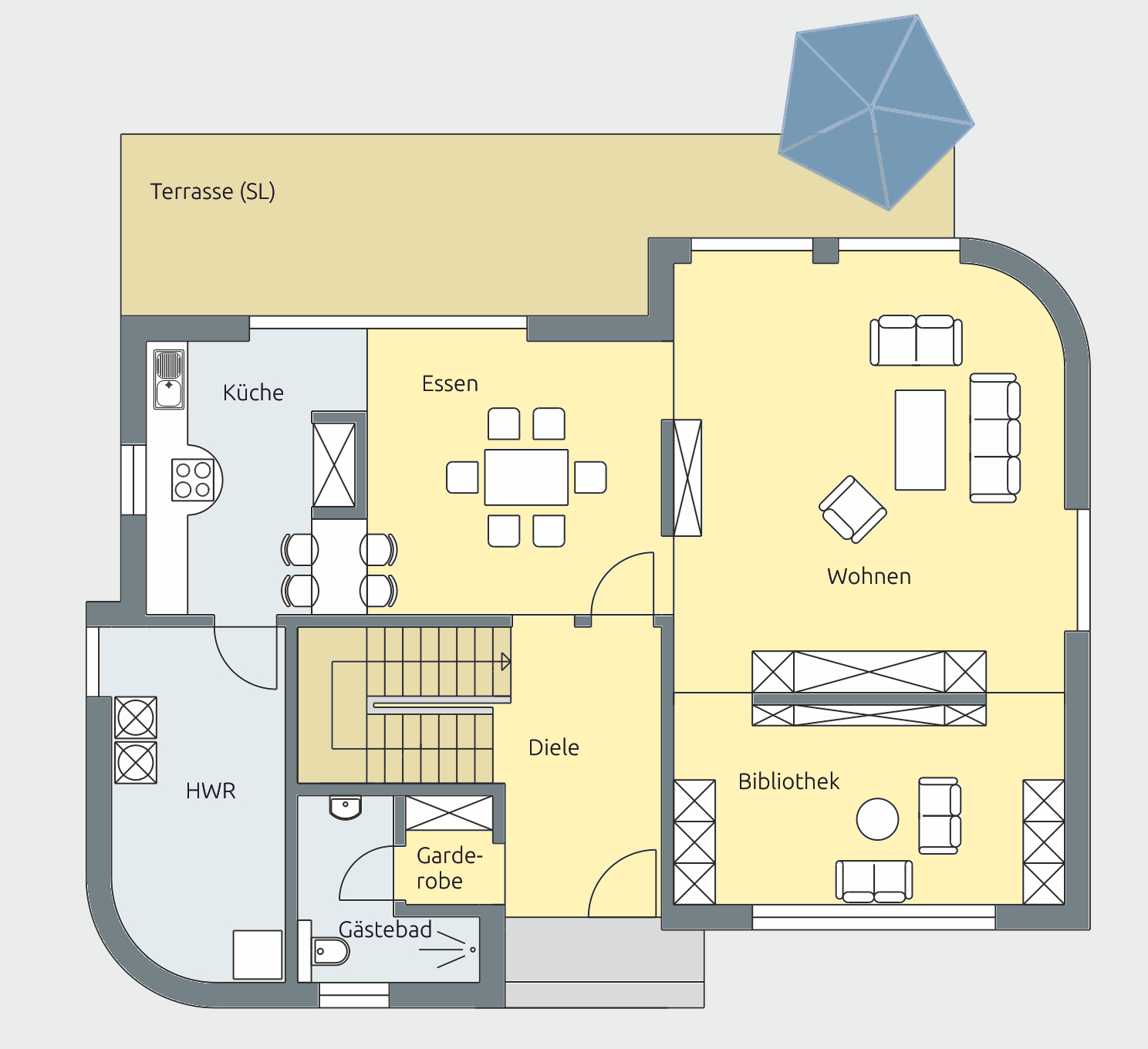 Im Erdgeschoss öffnet sich ein weitläufiger Wohn- und Essbereich mit fließenden Übergängen. Die geschwungene Außenwand im Wohnbereich sorgt für eine außergewöhnliche Raumwirkung und schafft eine Atmosphäre, die man so nicht oft findet. Die Küche ist funktional integriert und über kurze Wege mit Essplatz und Terrasse verbunden.