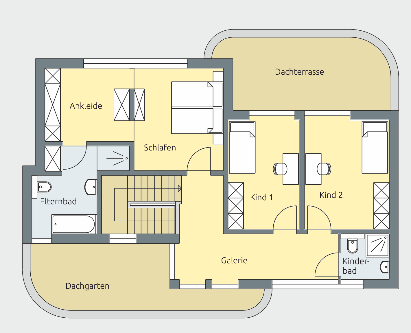 Im Obergeschoss setzt sich das großzügige Raumgefühl fort. Das Elternschlafzimmer mit Ankleide und eigenem Bad bildet eine komfortable Einheit. Zwei helle Kinderzimmer verfügen über direkten Zugang zur Galerie und profitieren von einem separaten Kinderbad.