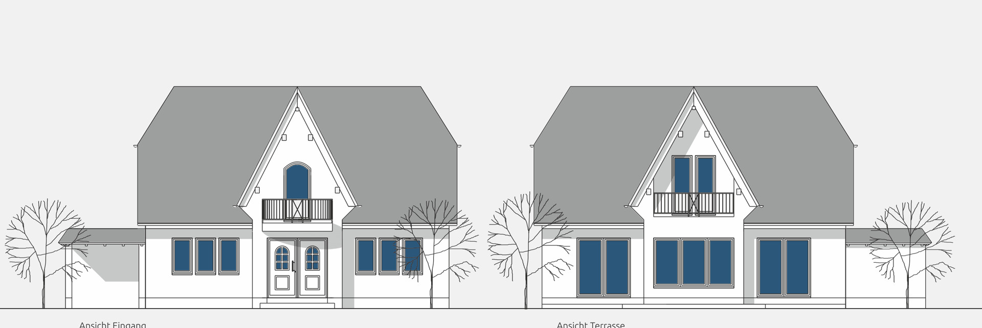Ein besonderes architektonisches Detail ist der Rundbalkon über dem Eingangsbereich, der dem Haus eine elegante Note verleiht und den Friesengiebel zusätzlich betont. Auf der Gartenseite sorgt eine geschützte Loggia im Obergeschoss für einen attraktiven Außenbereich mit Blick auf Terrasse und Garten.