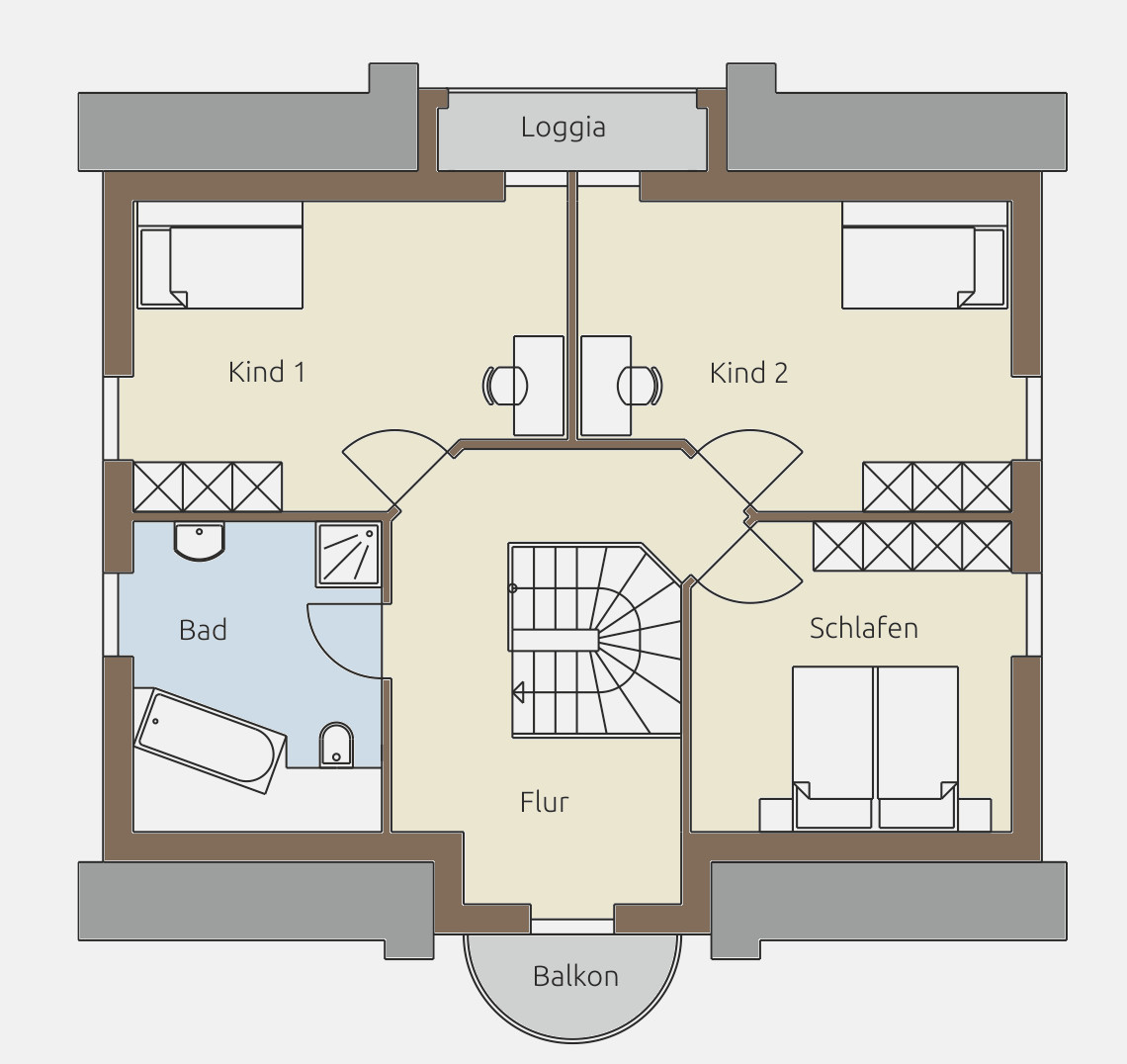 Im Obergeschoss befinden sich die privaten Räume der Familie. Die Zimmer sind um einen zentralen Flurbereich mit Treppe angeordnet und bieten eine angenehme Raumaufteilung. Ein besonderes Highlight sind die beiden Außenbereiche im Obergeschoss. Während die Loggia auf der Gartenseite einen geschützten Platz zum Entspannen bietet, setzt der Rundbalkon über dem Eingang einen markanten architektonischen Akzent und eröffnet einen schönen Blick auf die Umgebung.