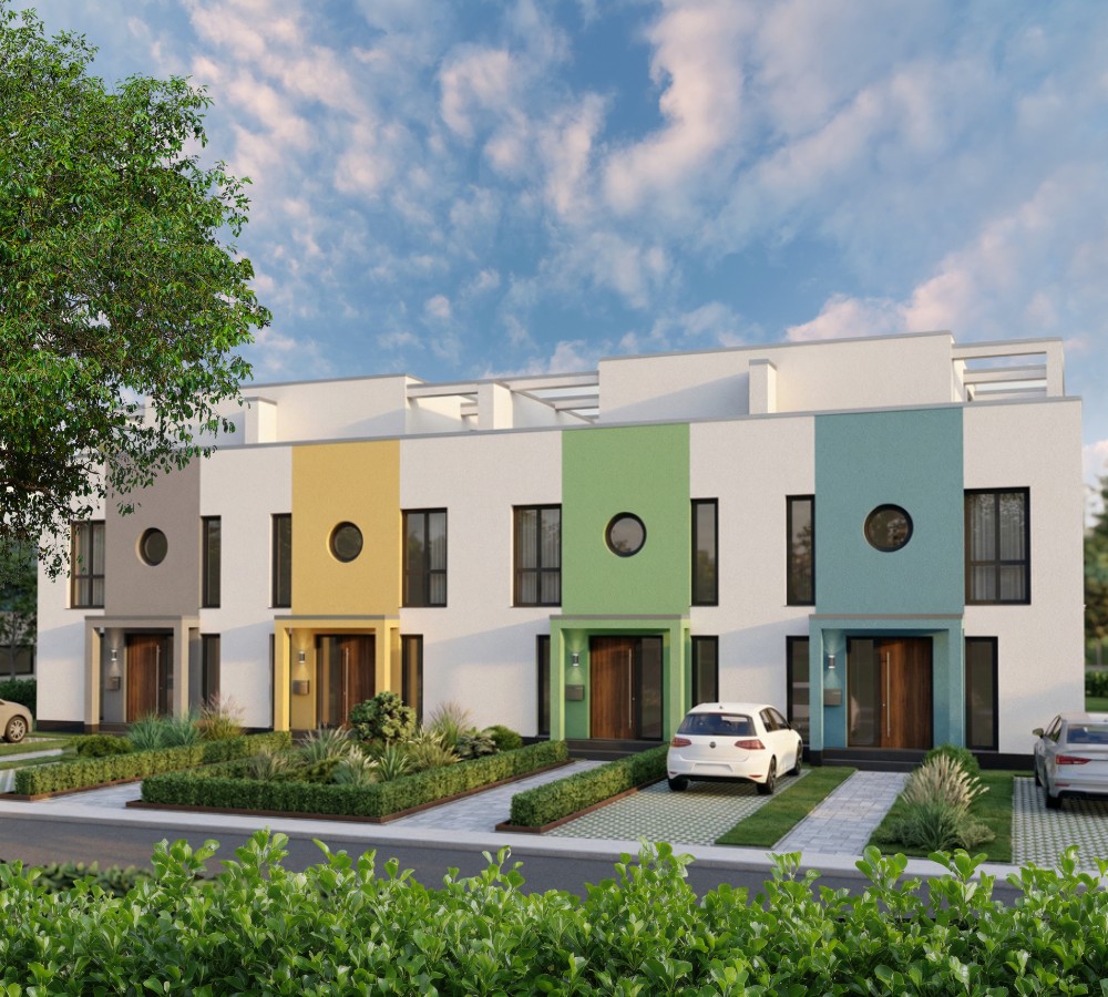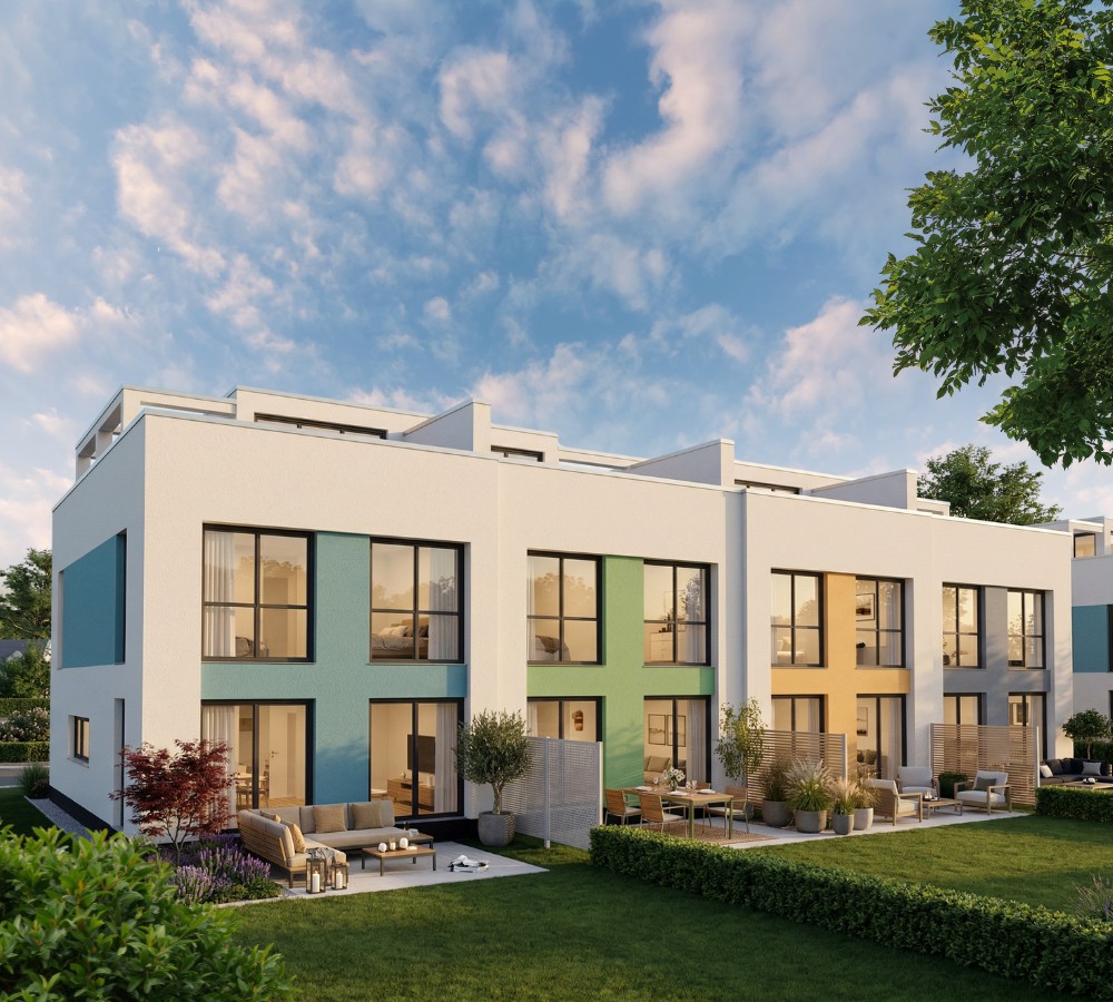 Im ersten Quartier entstehen insgesamt 13 Reihenhäuser, angeordnet in kleinen, überschaubaren Einheiten mit jeweils drei bzw. vier Häusern pro Reihe. Diese Gliederung sorgt für eine angenehme Nachbarschaftsstruktur.