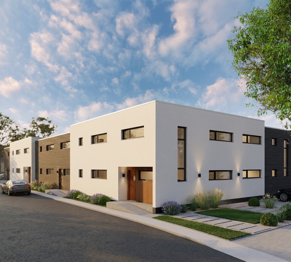 Das zweite Quartier setzt einen ganz eigenen Akzent innerhalb des Gesamtprojekts. Hier entstehen insgesamt acht Gartenhofhäuser – fünf zweigeschossige Gebäude und drei eingeschossige Häuser im Bungalow-Stil. Trotz der unterschiedlichen Höhen wirkt das Quartier wie aus einem Guss, getragen von einer klaren, modernen Architektursprache.