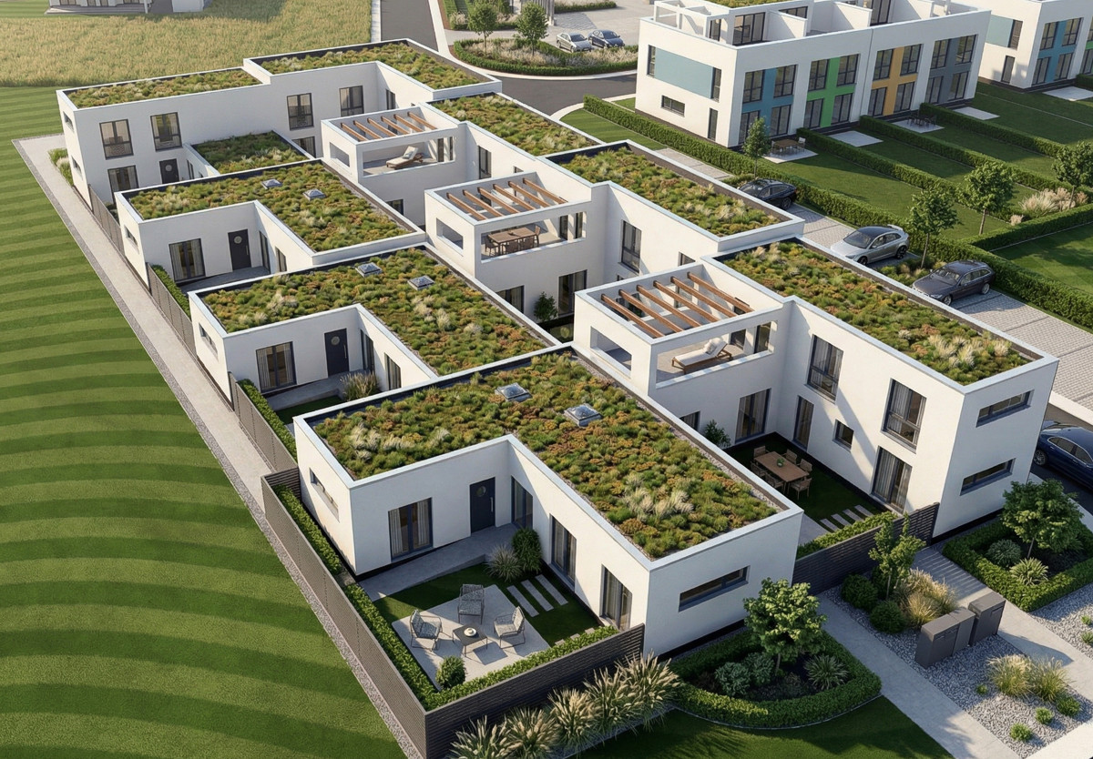 Großzügige Außenbereiche, durchdachte Grundrisse und eine ruhige, strukturierte Anordnung der Gebäude schaffen ein Wohnumfeld, das sowohl funktional als auch angenehm zurückhaltend wirkt.