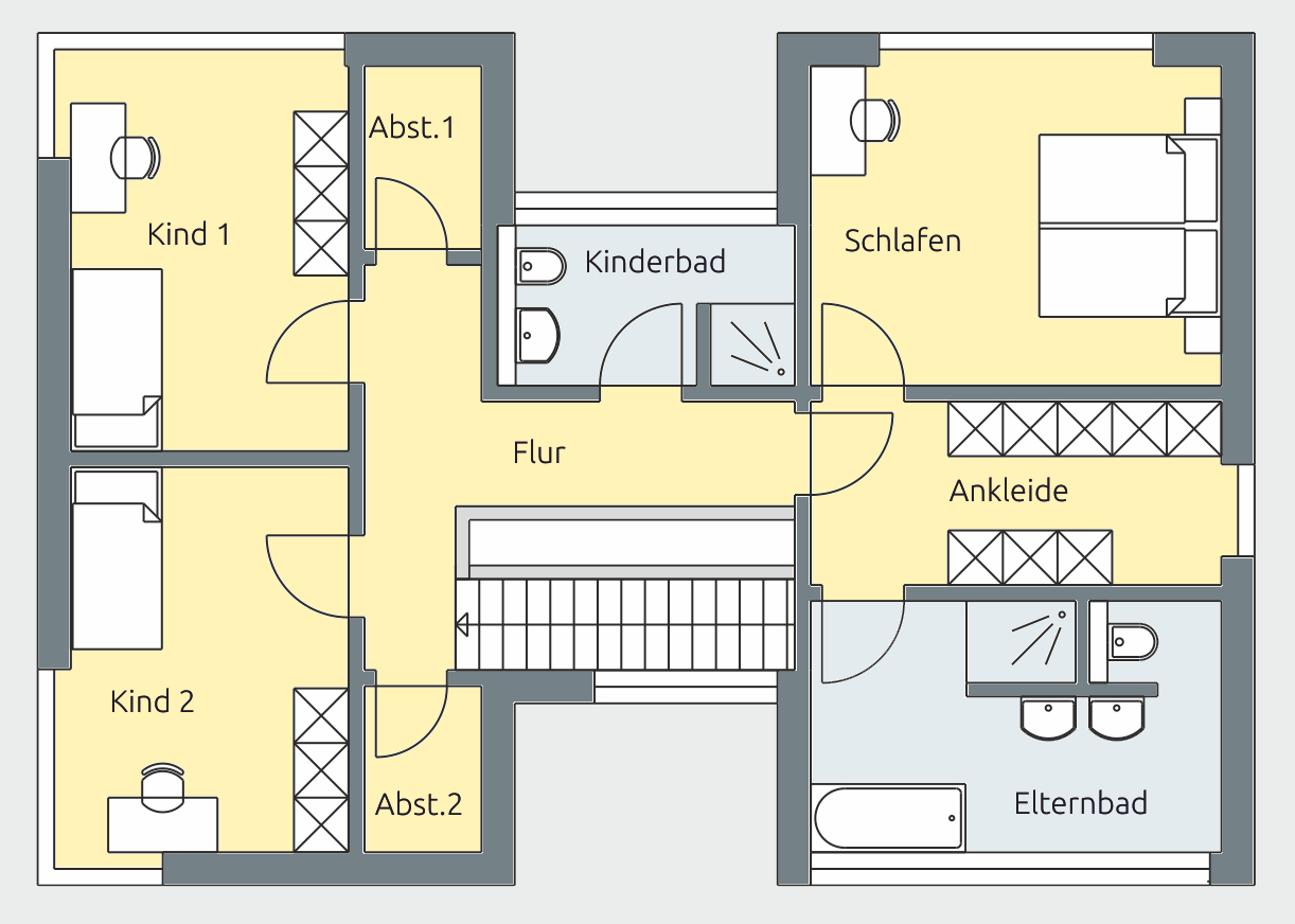 Auch im Obergeschoss setzt sich das Prinzip der Zweiteilung fort. Zwei gut geschnittene Kinderzimmer bilden einen eigenen Bereich mit separatem Kinderbad. Ergänzt werden sie durch praktische Abstellräume, die für Ordnung sorgen.