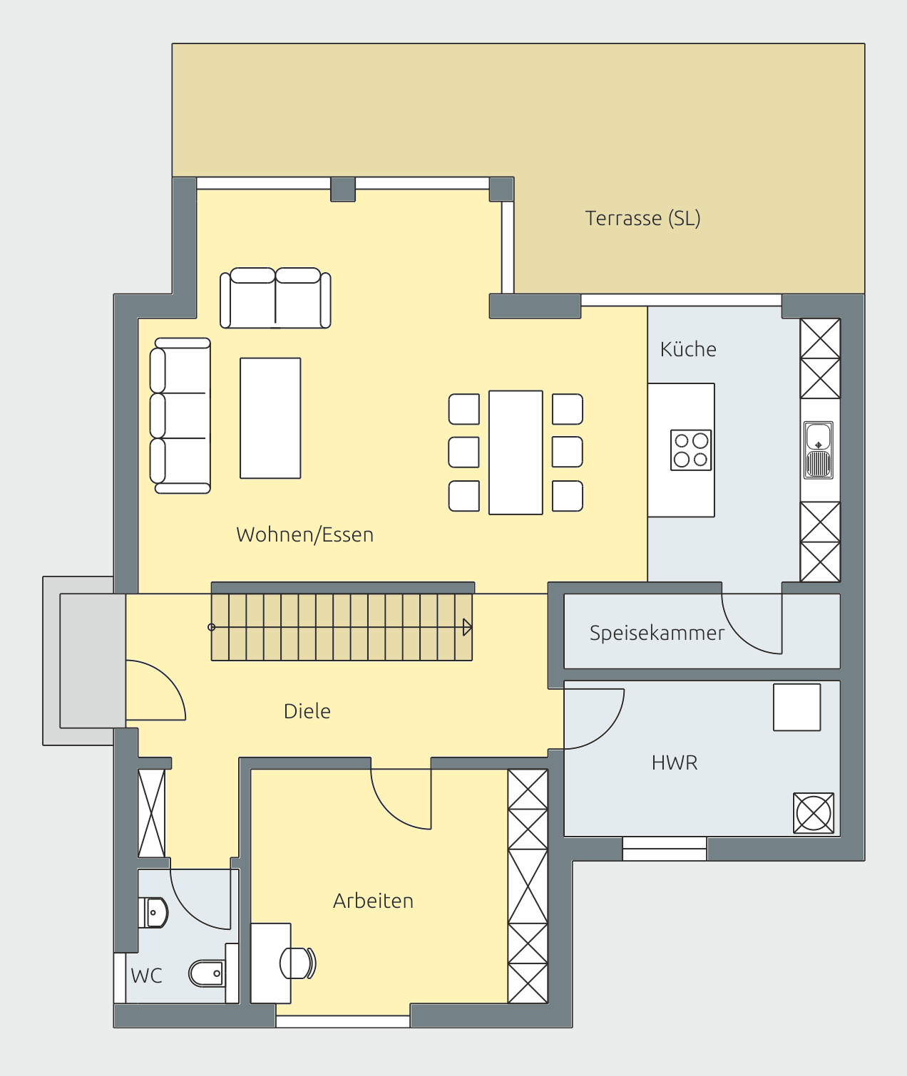 Ein zusätzlicher Raum für Arbeiten bietet Flexibilität. Ob Homeoffice, Gästezimmer oder Hobbybereich – hier entsteht ein separater Rückzugsort im Erdgeschoss. Ergänzt wird die Ebene durch Hauswirtschaftsraum, Gäste-WC und eine großzügige Diele mit klarer Wegeführung.