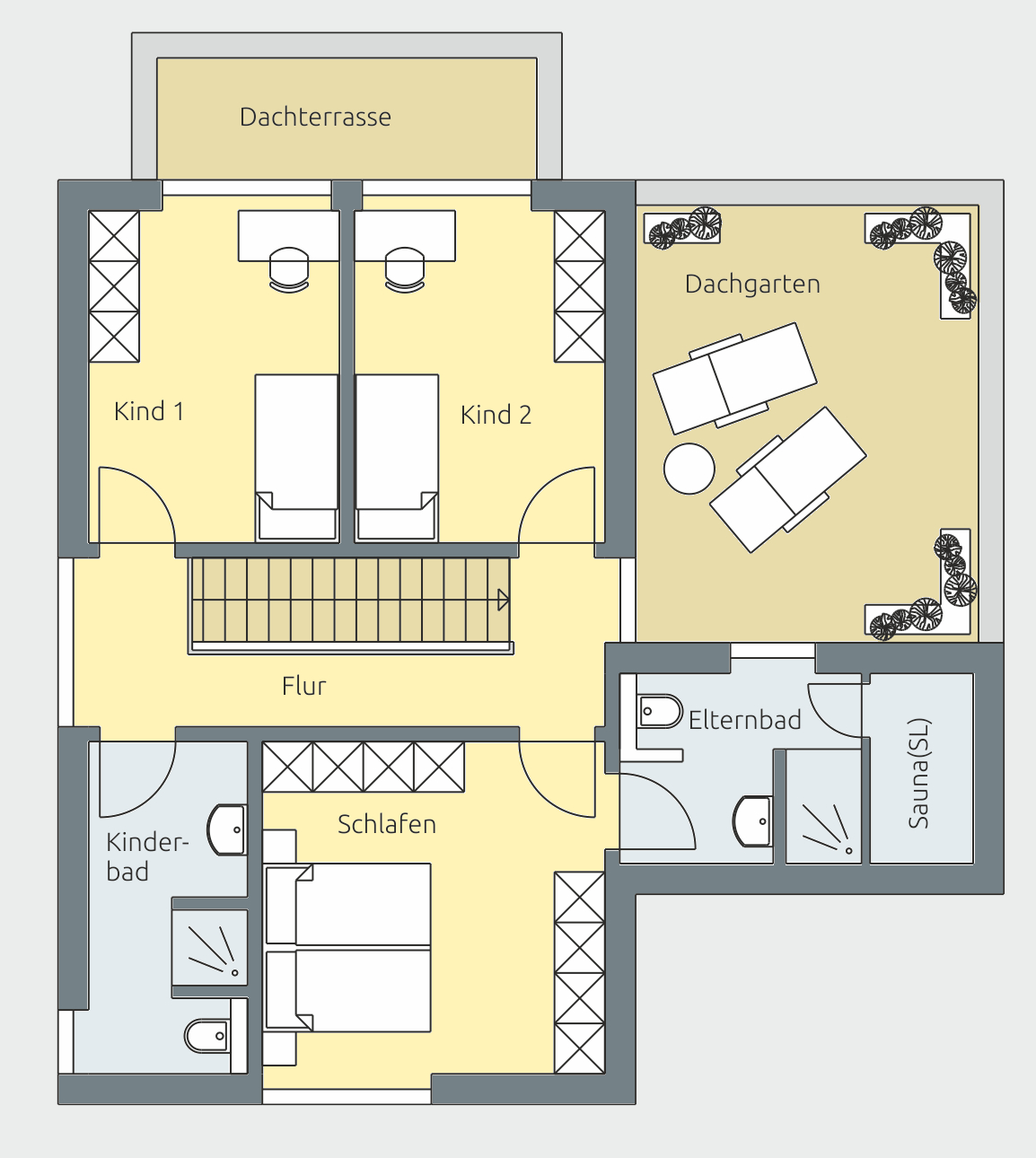 Im Obergeschoss entfaltet das Kubus 130 seine architektonische Besonderheit. Die beiden Kinderzimmer sind nicht nur gut geschnitten und hell, sie verfügen über einen direkten Zugang zur gemeinsamen Dachterrasse. Dieser geschützte Außenbereich wird zur Erweiterung der Kinderzimmer - ein Ort zum Spielen, Lesen oder einfach Frischluft genießen.