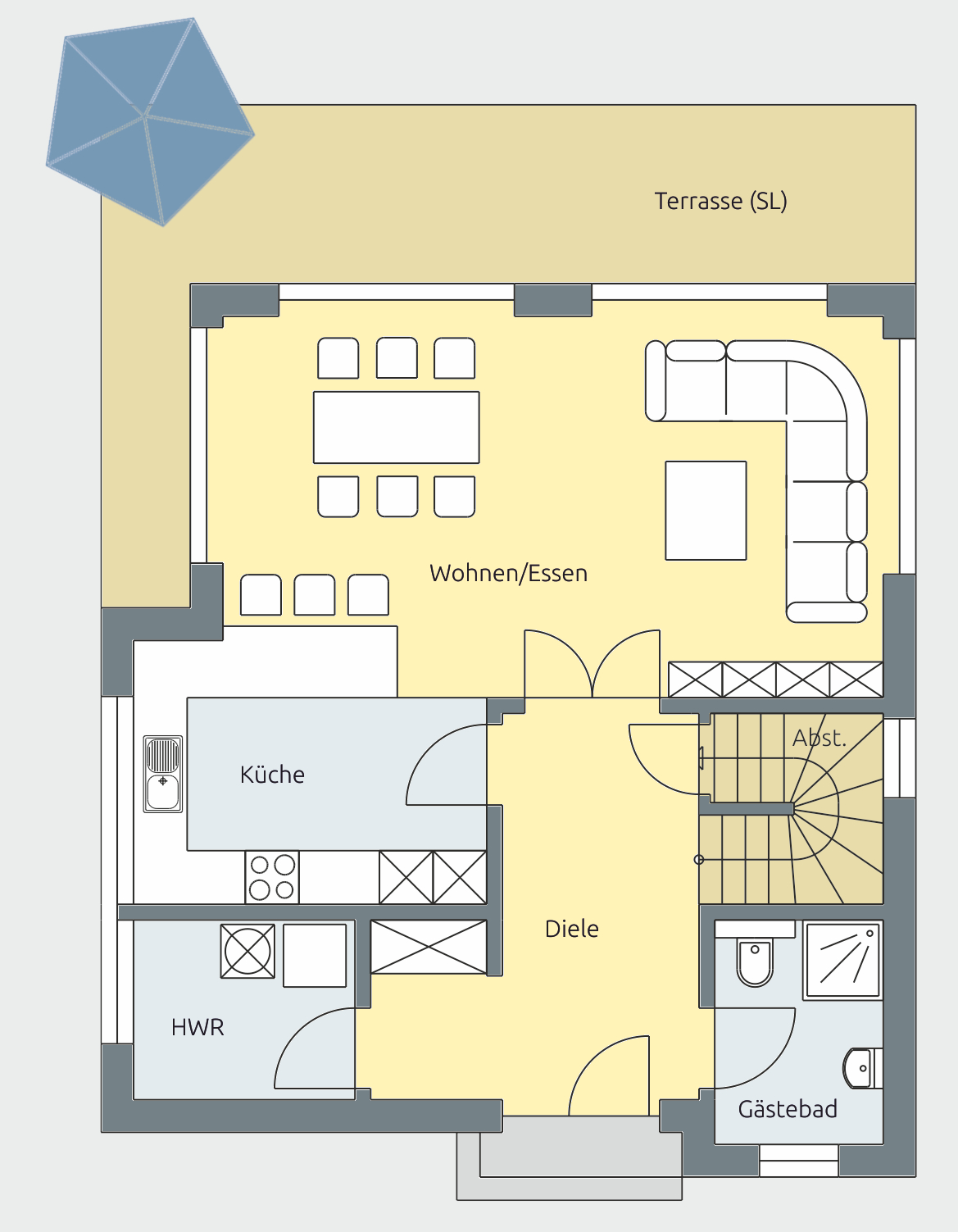 Der Eingangsbereich führt in eine großzügige Diele mit direktem Zugang zum Gästebad sowie zum Hauswirtschaftsraum. Von hier öffnet sich der Blick in den zentralen Wohn- und Essbereich. Große Fensterflächen zur Terrasse sorgen für viel Tageslicht und verbinden Innen und Außen auf natürliche Weise.