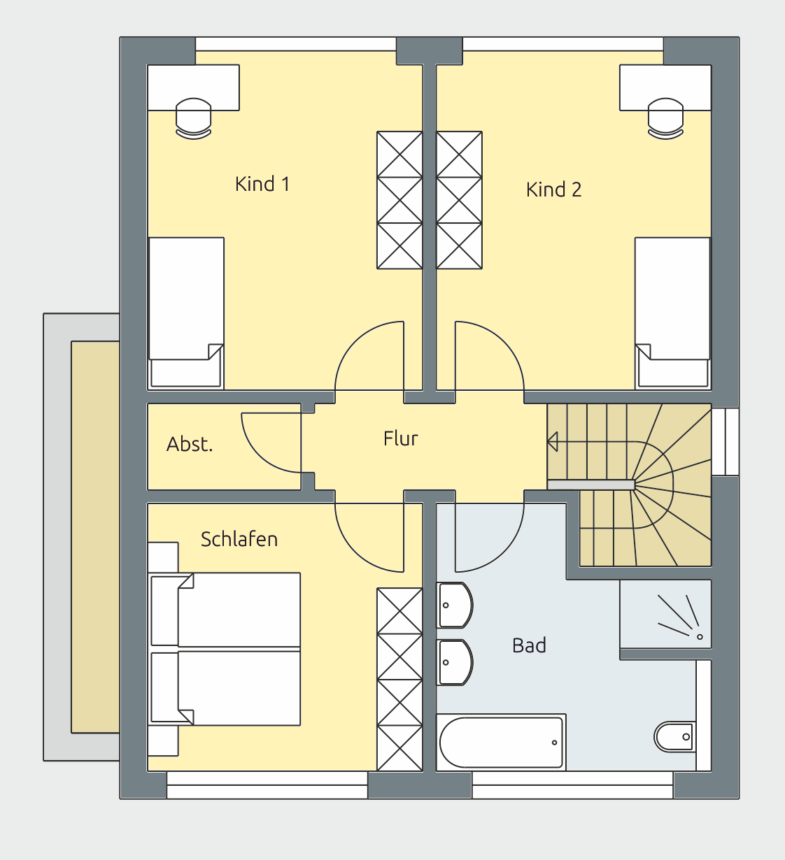 Im Obergeschoss setzt sich die klare Struktur fort. Zwei gleichwertige Kinderzimmer schaffen faire Bedingungen für die ganze Familie. Das Elternschlafzimmer überzeugt mit angenehmer Proportion und zusätzlicher Abstellfläche.