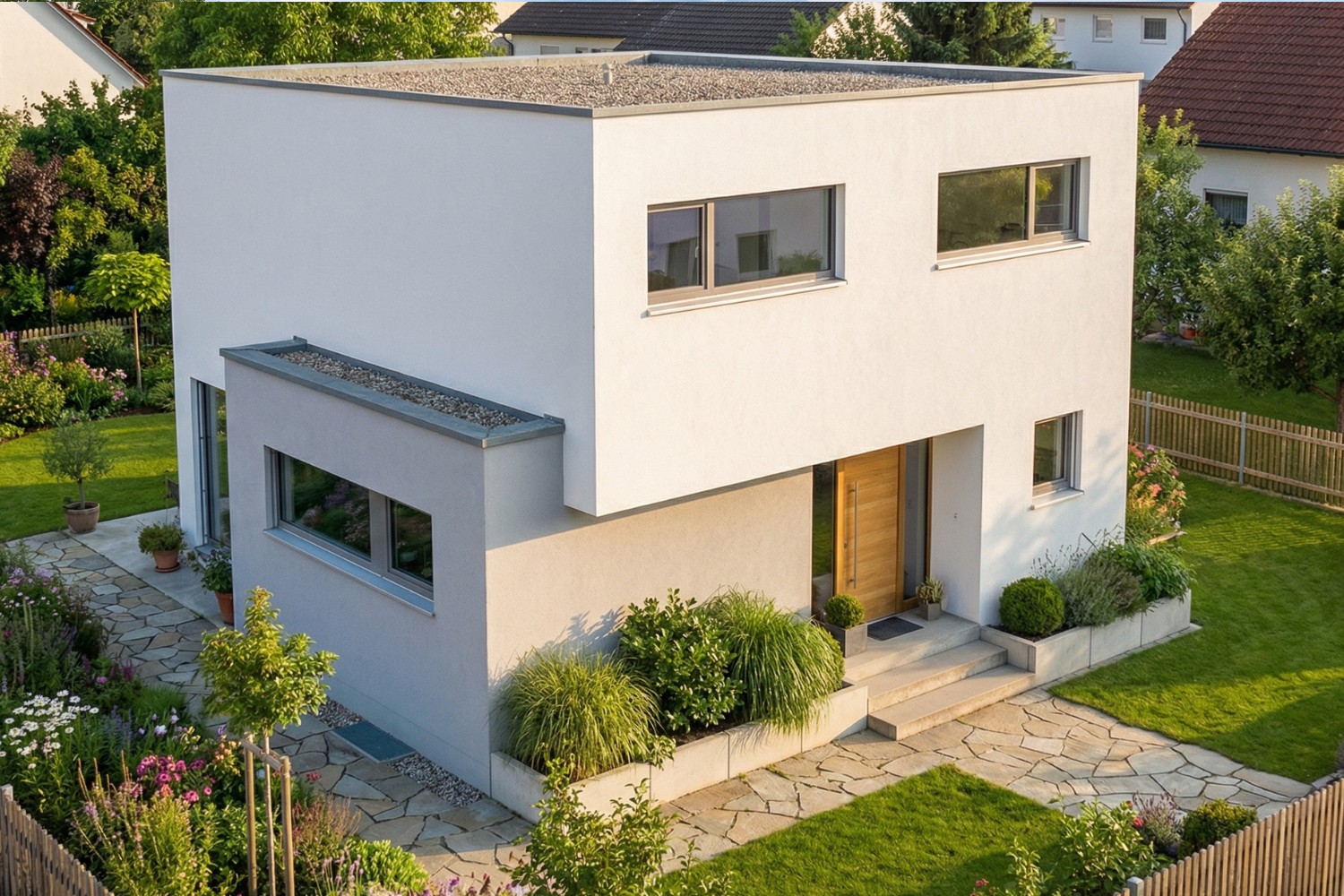 Das Kubus 50 steht für konsequente Bauhaus-Architektur in ihrer puren Form. Zwei klar übereinander gesetzte Kuben, reduzierte Details und präzise gesetzte Fensterflächen prägen das Erscheinungsbild. Die versetzte Baukörperstruktur schafft Spannung und verleiht dem Haus eine eigenständige Silhouette – modern, ruhig und selbstbewusst.