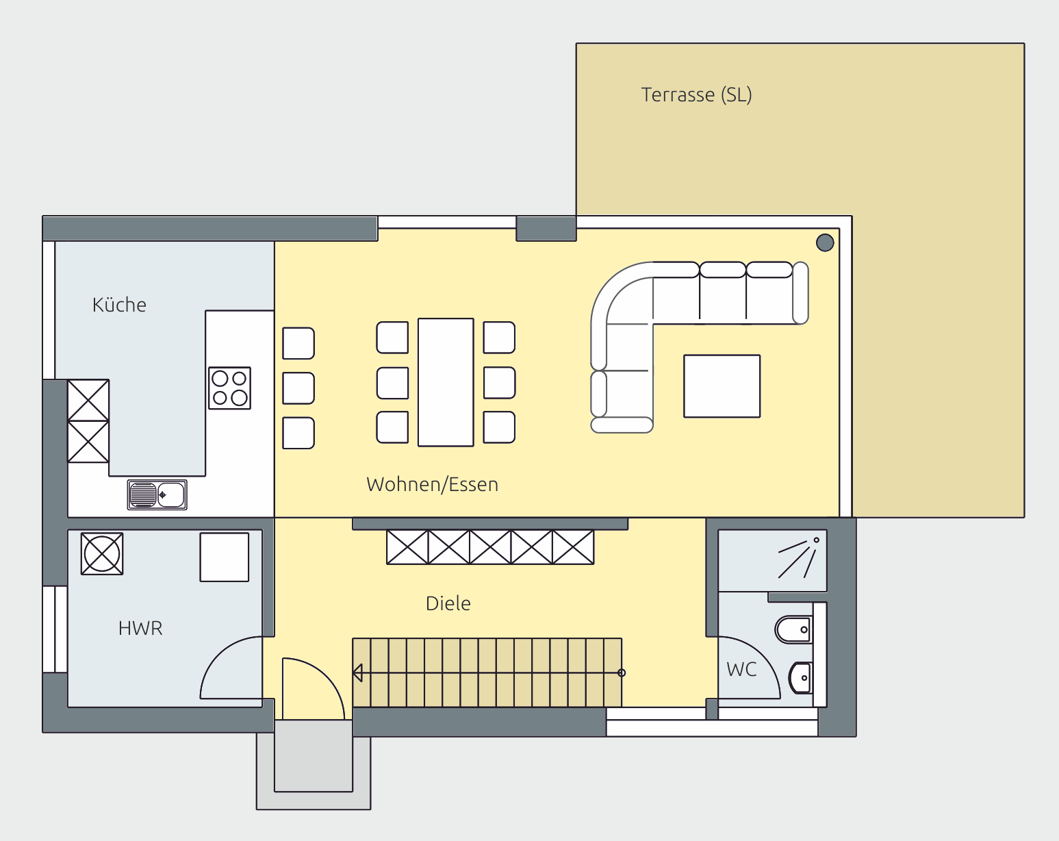 Die großzügige Terrasse erweitert den Wohnraum nach außen und schafft Platz für gesellige Abende oder entspannte Stunden im Freien.