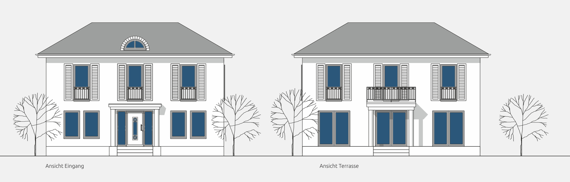 Ein markantes Detail ist das klassische Säulenportal im Eingangsbereich, das dem Gebäude eine repräsentative Wirkung gibt. Auf der Gartenseite setzt ein säulengetragener Balkon über der Terrasse einen weiteren architektonischen Akzent. Ergänzt wird das Erscheinungsbild durch französische Balkone und dekorative Klappläden im Obergeschoss, die dem Haus einen leichten, fast mediterranen Charakter verleihen.