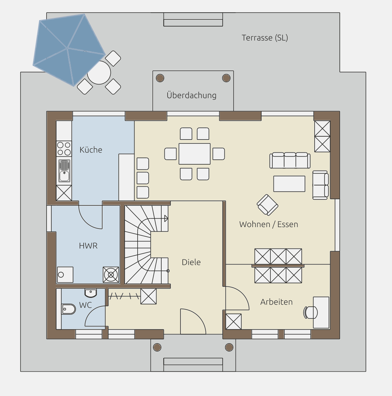 Das Erdgeschoss ist großzügig und familienfreundlich geplant. Mittelpunkt des Hauses ist der helle Wohn- und Essbereich, der sich über die gesamte Gartenseite erstreckt und direkten Zugang zur Terrasse bietet. Große Fensterflächen schaffen eine offene Verbindung zwischen Innenraum und Garten.