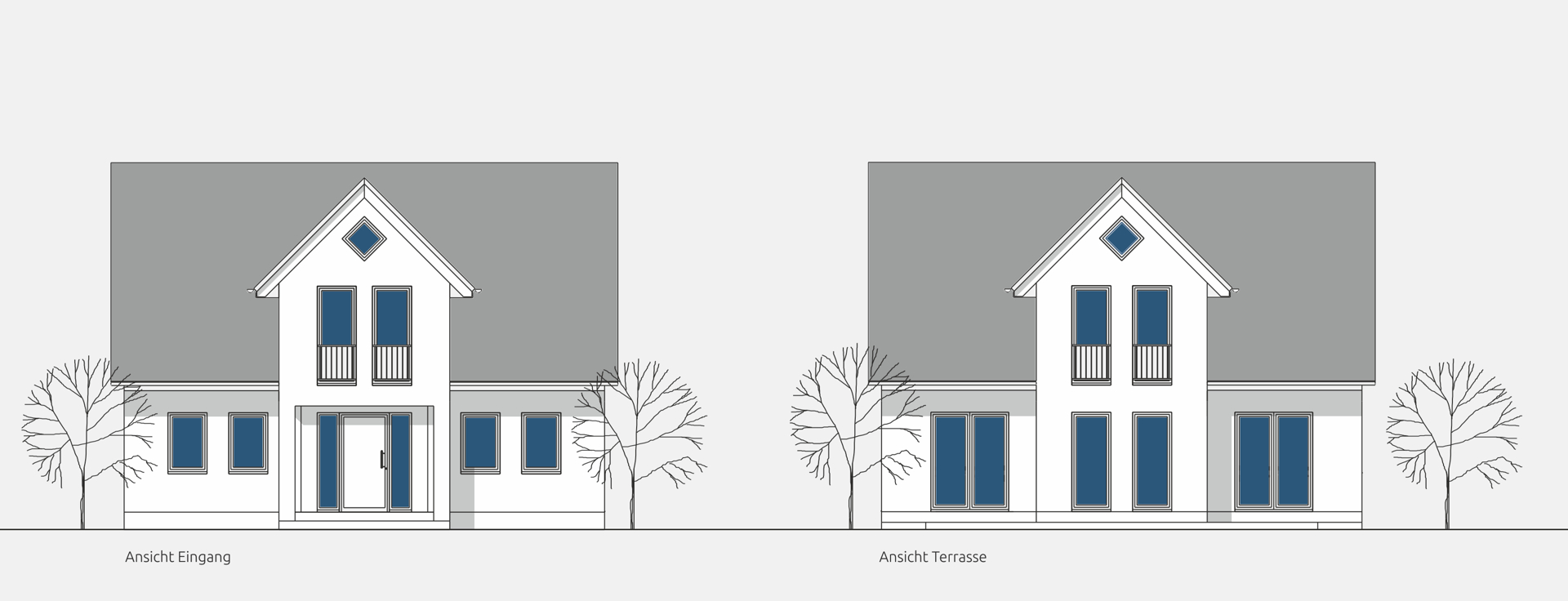 Ein harmonisches Vier-Giebelhaus mit Satteldach und überdachtem Eingangsbereich mit Säulen. Das großzügige Innere bietet einen offenen Wohn-Essbereich sowie ein Gästezimmer im Erdgeschoss, zwei Kinderzimmer und ein Elternschlafzimmer im Dachgeschoss.