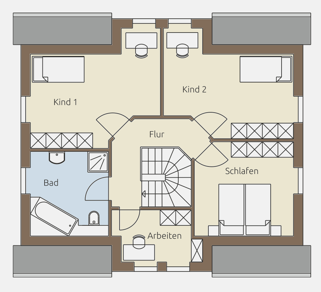 Das Obergeschoss ist klassisch und funktional aufgeteilt und bietet ausreichend Platz für die gesamte Familie. Die zentrale Erschließung über den Flur sorgt für kurze Wege und eine angenehme Raumstruktur. Große Fenster sorgen auch hier für helle und freundliche Räume.