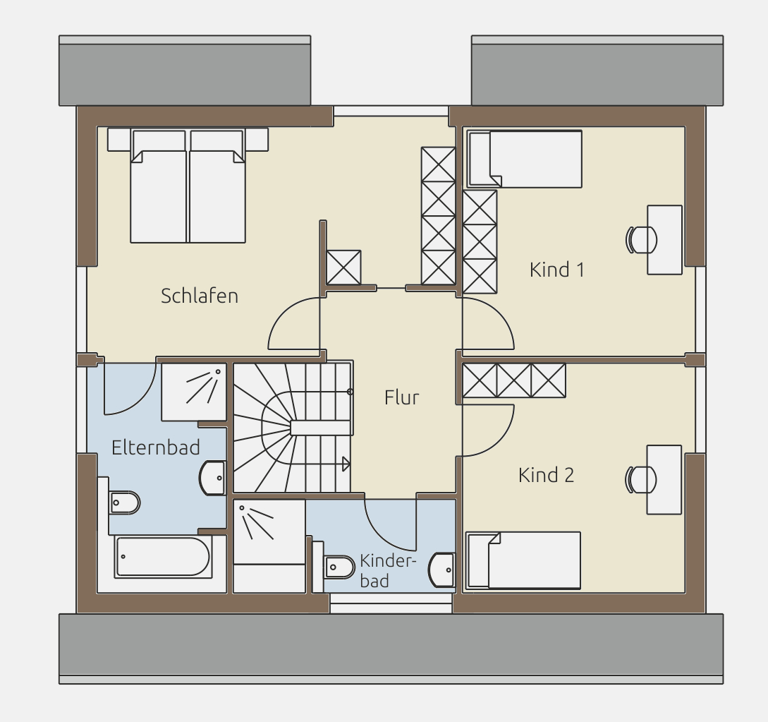Im Dachgeschoss befindet sich der private Rückzugsbereich der Familie. Die Räume sind klar strukturiert und bieten ausreichend Platz für individuelle Bedürfnisse. Die Aufteilung sorgt für kurze Wege und schafft gleichzeitig ausreichend Privatsphäre für jedes Familienmitglied.