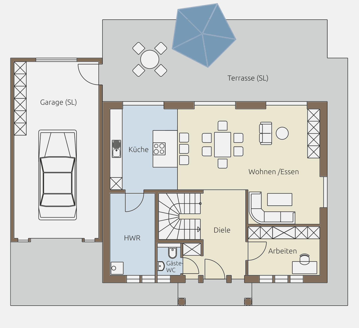 Das Erdgeschoss ist großzügig und funktional gestaltet. Mittelpunkt des Hauses ist der helle Wohn- und Essbereich, der viel Platz für gemeinsames Familienleben bietet. Große Fensterflächen sorgen für eine freundliche Atmosphäre und eröffnen den Blick in den Garten.