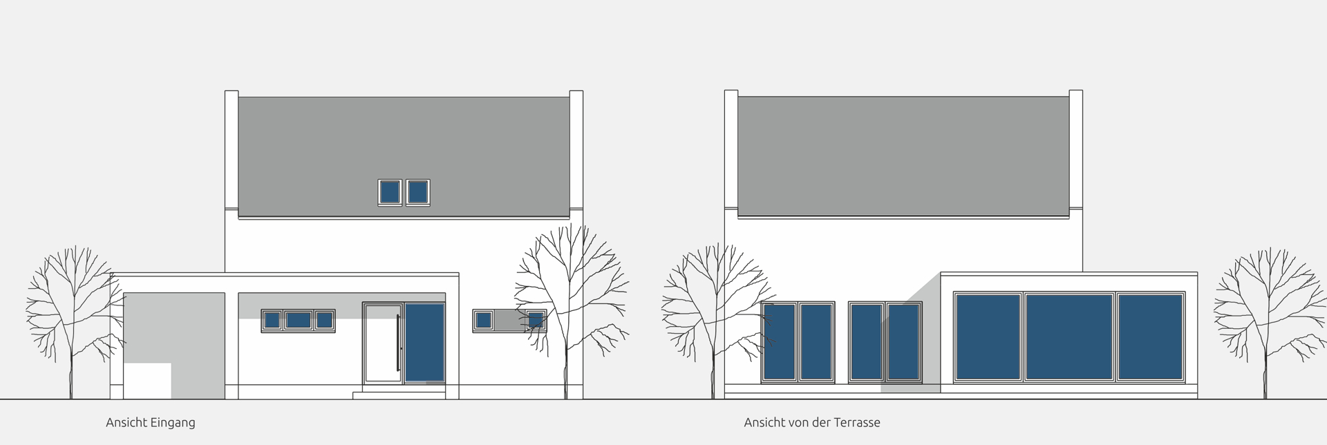 Dieser Entwurf ist geprägt durch die Giebel im Eingangs- und Terrassenbereich.