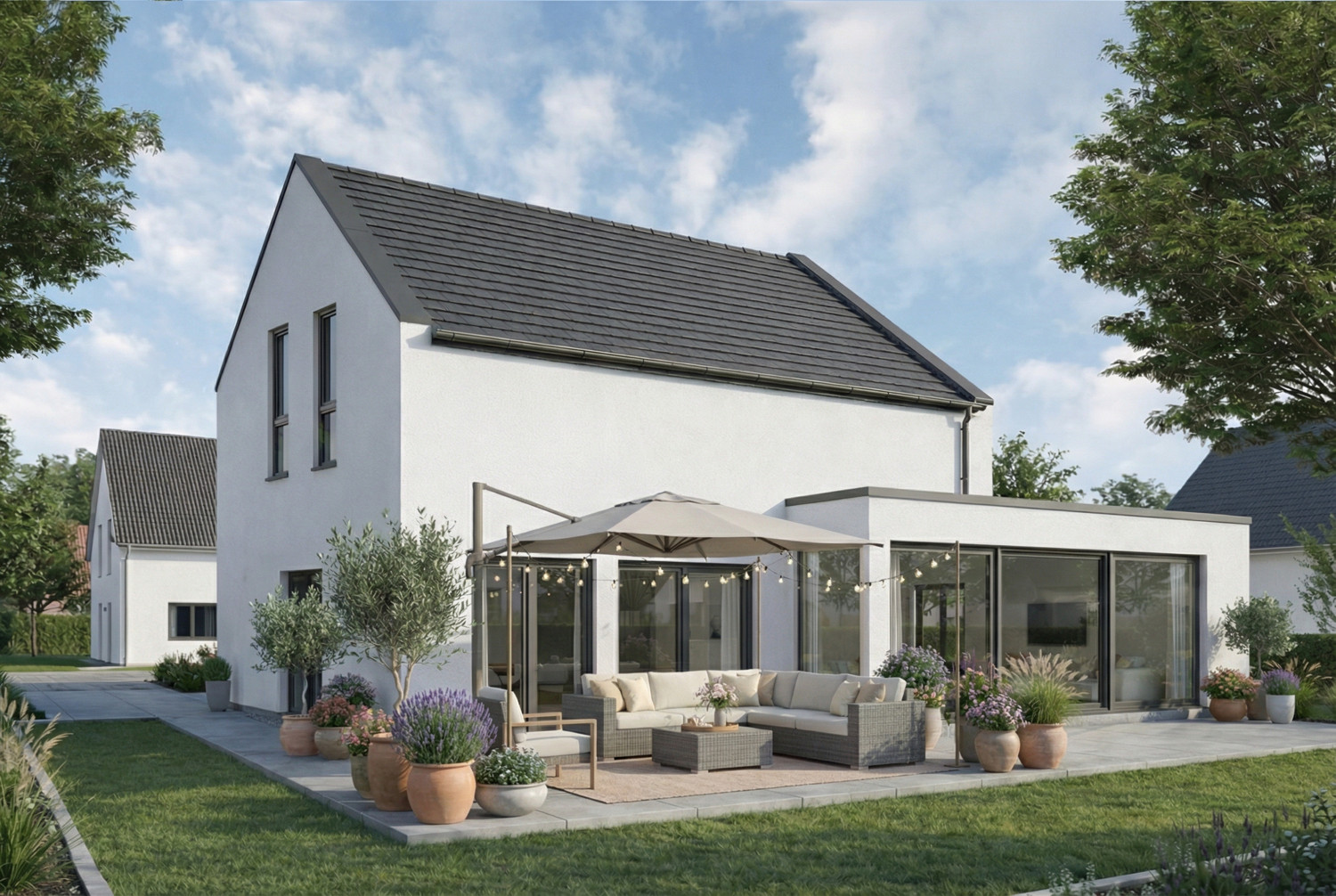 Das Stadthaus 100S verbindet klassische Architektur mit moderner Offenheit. Der geradlinige Baukörper mit Satteldach wirkt zeitlos und ruhig, während die großen Fensterflächen für helle, freundliche Räume sorgen. Auf der Gartenseite öffnet sich das Haus weit zur Terrasse und schafft eine fließende Verbindung zwischen innen und außen. Im Erdgeschoss steht das gemeinsame Leben im Mittelpunkt.