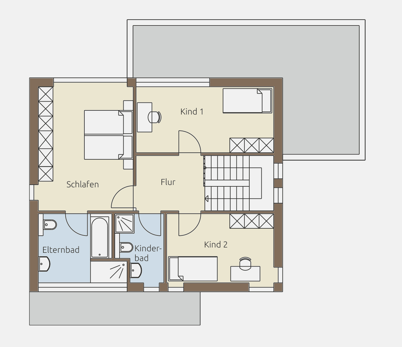 Im Obergeschoss überzeugt das 110S mit einer klar gegliederten Raumstruktur. Zwei großzügige Kinderzimmer bieten ausreichend Platz zum Spielen, Lernen und Rückzug. Das Elternschlafzimmer verfügt über direkten Zugang zum eigenen Bad und schafft so eine komfortable, private Einheit. Ein zusätzliches Kinderbad sorgt für entspannte Morgenabläufe im Familienalltag.