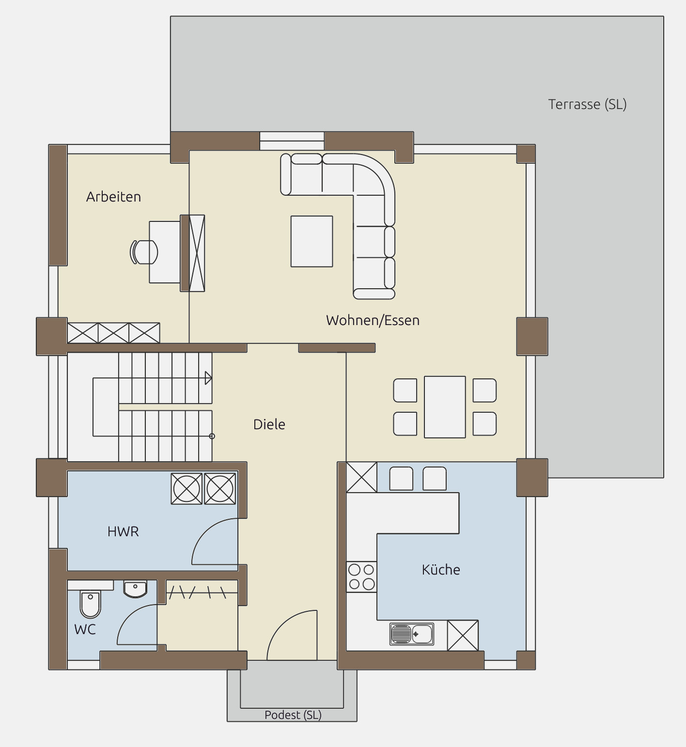 Im Erdgeschoss empfängt Sie eine zentrale Diele, die den Blick direkt in den hellen Wohn- und Essbereich freigibt. Hier entsteht das Herz des Hauses: viel Platz für gemeinsame Zeit, große Fensterflächen mit direktem Zugang zur Terrasse und eine offene Raumwirkung, die Leichtigkeit vermittelt.