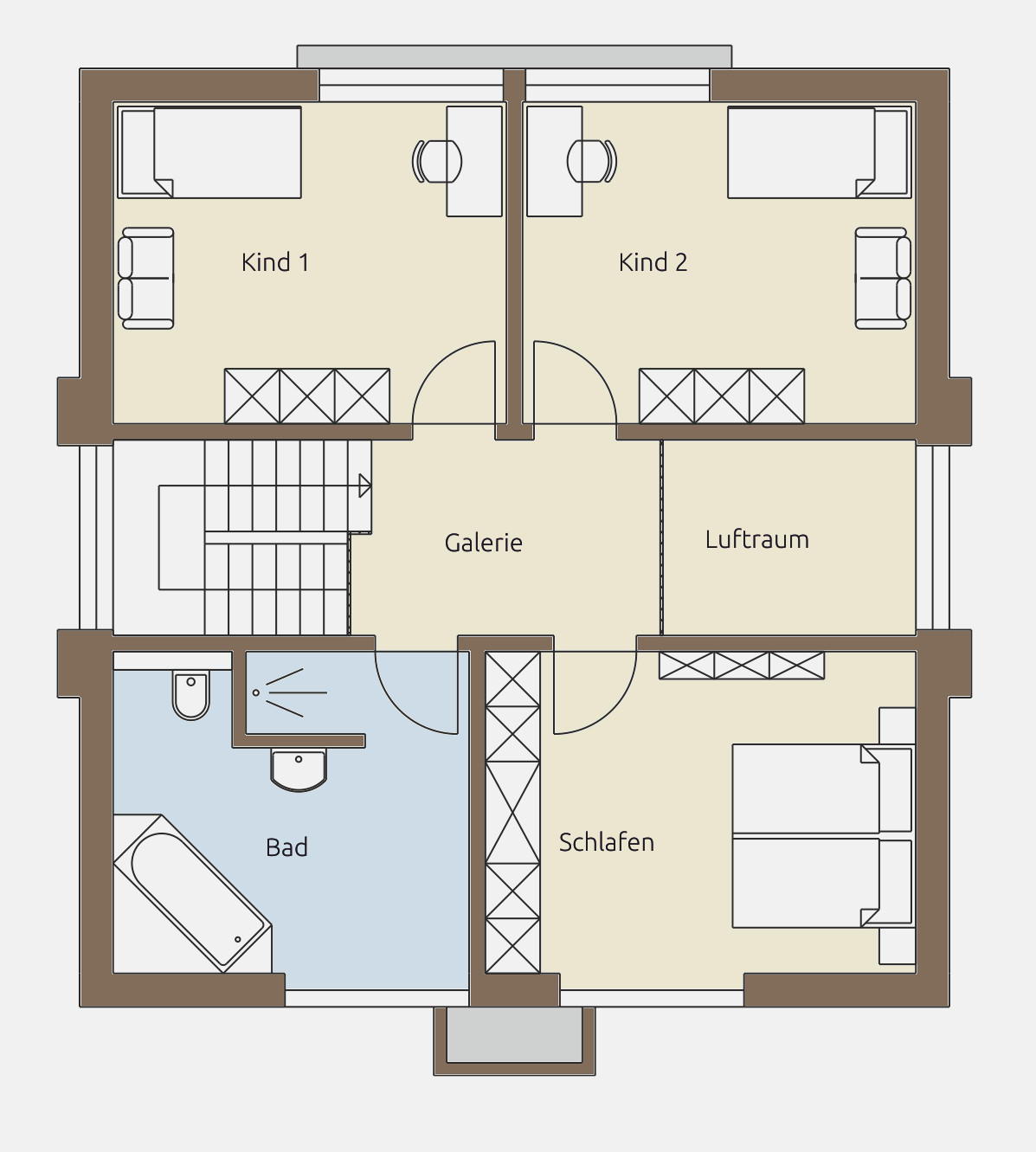 Im Obergeschoss setzt sich das durchdachte Konzept fort. Zwei gut geschnittene Kinderzimmer bieten ausreichend Platz zum Lernen, Spielen und Entspannen. Das Elternschlafzimmer überzeugt mit angenehmer Größe und klarer Struktur. Mittelpunkt der Etage ist die Galerie mit offenem Luftraum – ein architektonisches Highlight, das für Weite, Licht und ein besonderes Wohngefühl sorgt. Das großzügige Familienbad bietet Raum für entspannte Morgen und ruhige Abendstunden.