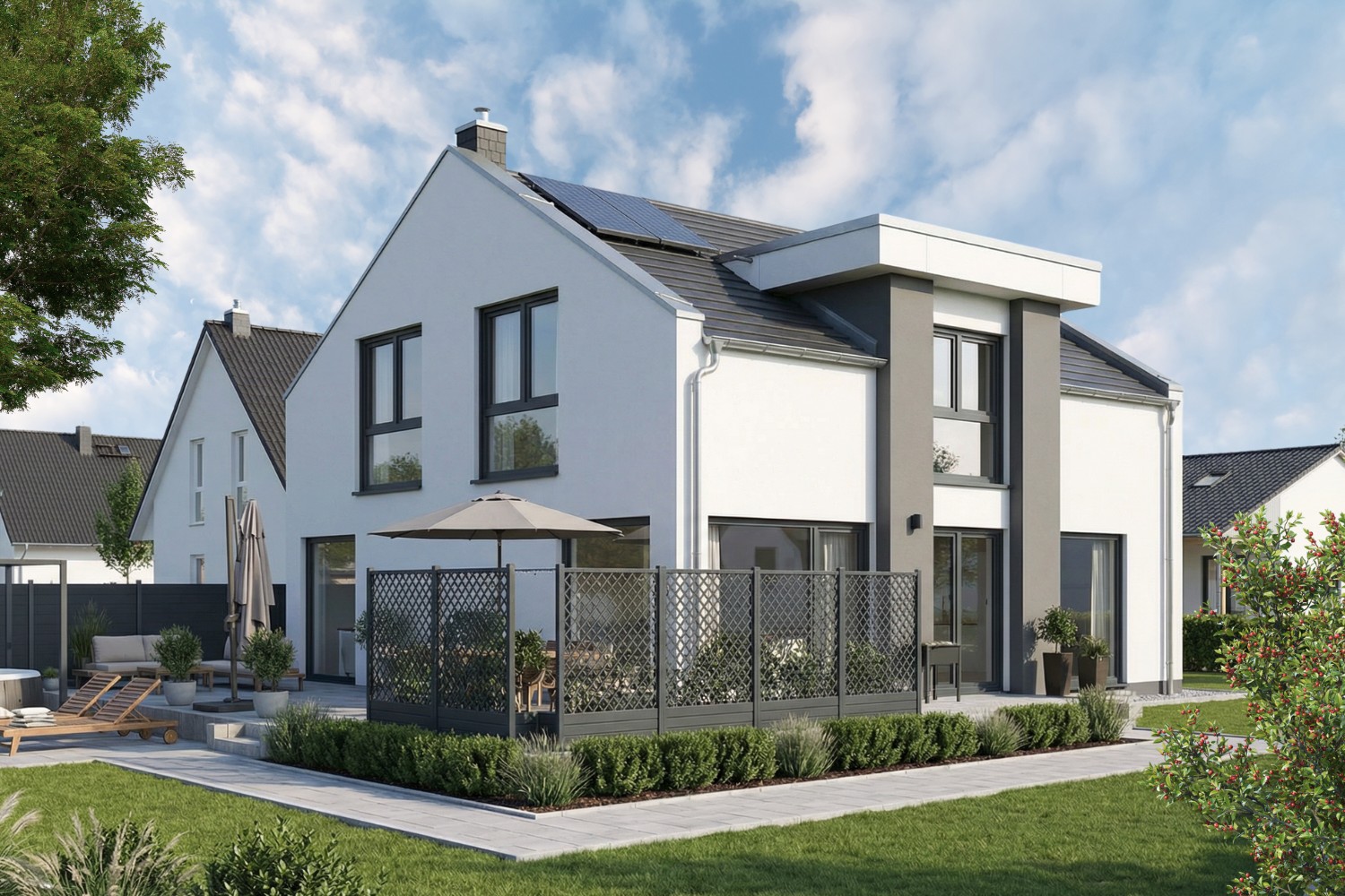 Modernes Einfamilienhaus mit klassischem Satteldach und klaren Linien.