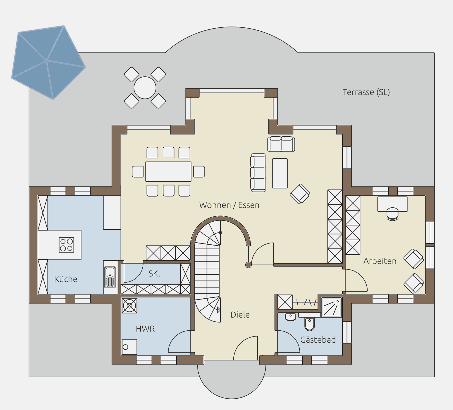 Die Küche ist separat geplant, bleibt aber in unmittelbarer Nähe zum Essbereich. Ergänzend stehen ein Hauswirtschaftsraum (HWR) sowie eine praktische Speisekammer zur Verfügung – ideal für eine strukturierte und alltagstaugliche Raumorganisation. Der Grundriss eignet sich besonders für Familien, die offene Wohnbereiche mit funktionaler Raumaufteilung kombinieren möchten.