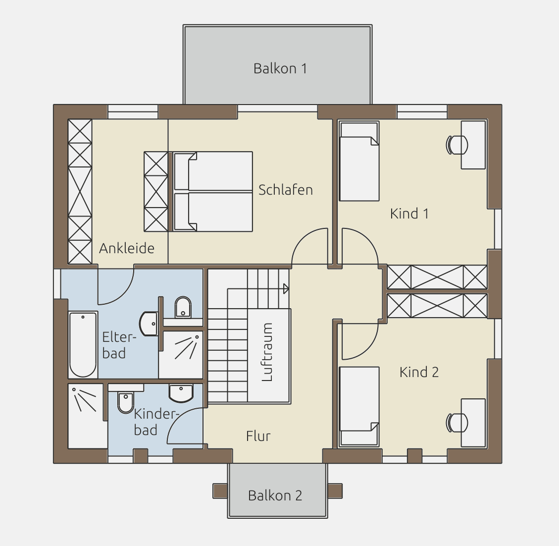 Im Obergeschoss setzt sich das großzügige Raumgefühl fort. Die offene Galerie mit Luftraum schafft eine Verbindung zwischen den Etagen und bringt zusätzliches Licht ins Haus. Sie verleiht der Villa einen repräsentativen Charakter, ohne auf Wohnkomfort zu verzichten. Die klare Trennung zwischen Eltern- und Kinderbereich sorgt für Privatsphäre und Struktur im Alltag.