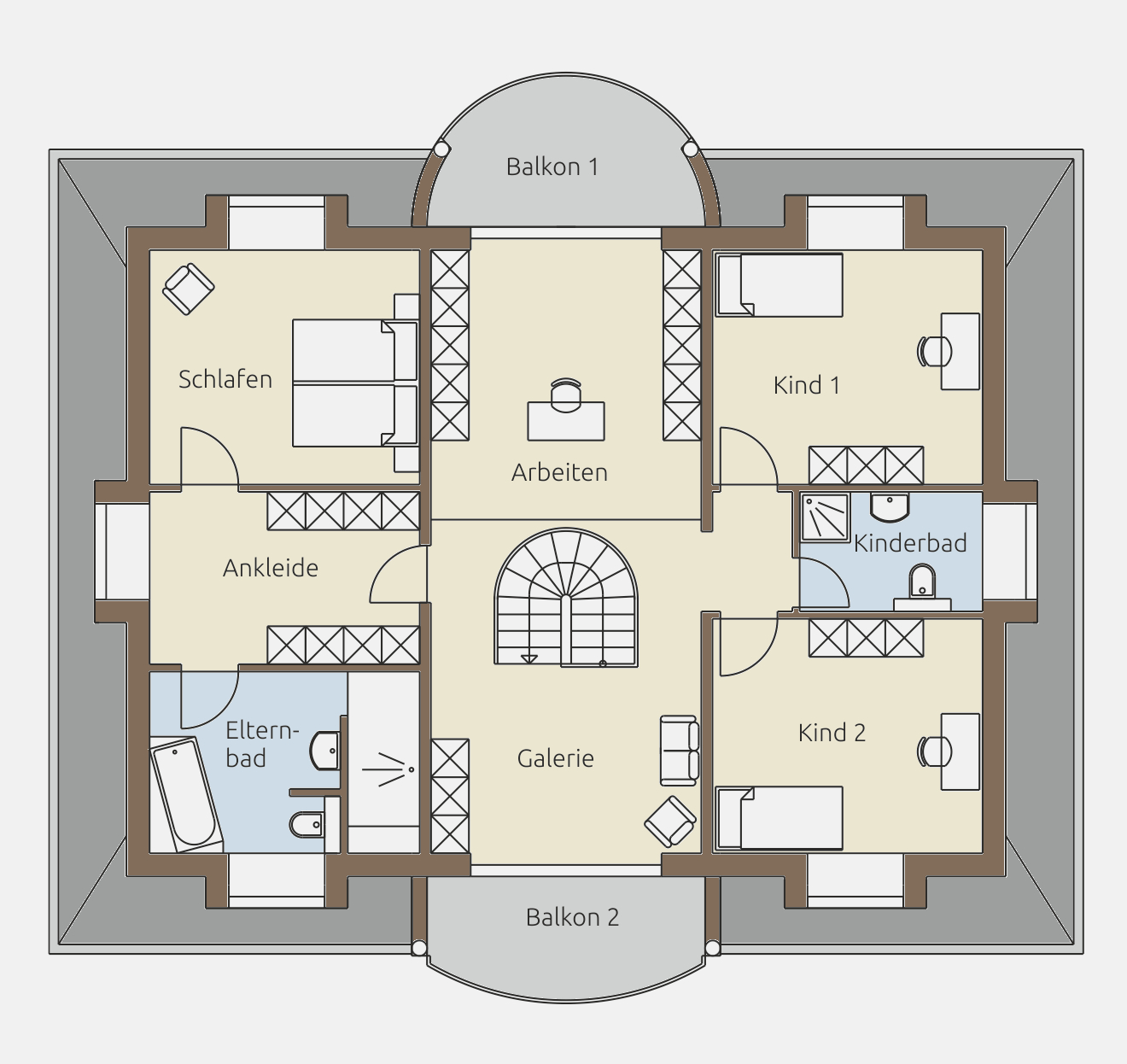 Im Dachgeschoss entfaltet die Villa 50V ihre besondere architektonische Qualität. Die beiden überhöhten Rundgauben schaffen in der Galerie und im Arbeitszimmer eine außergewöhnliche Raumhöhe und viel Licht. Hier entsteht ein repräsentativer, fast salonartiger Eindruck.Zwei Balkone erweitern die privaten Räume ins Freie und unterstreichen den villentypischen Charakter.