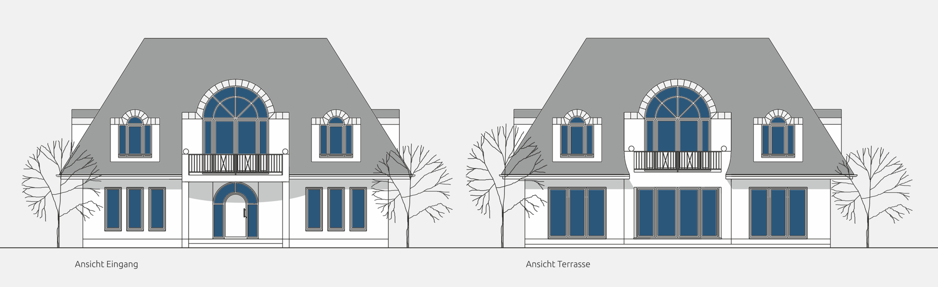 Die Villa 50V ist eine exklusive Stadtvilla mit hohem Walmdach und repräsentativer Fassadengestaltung. Hauptgauben und kleinere, untergeordnete Gauben bilden ein harmonisches Gesamtbild, das dem Haus seine elegante Silhouette verleiht. Zwei überhöhte Rundgauben setzen architektonische Akzente und schaffen im Dachgeschoss eine außergewöhnliche Raumwirkung – besonders in der Galerie und im Arbeitszimmer.